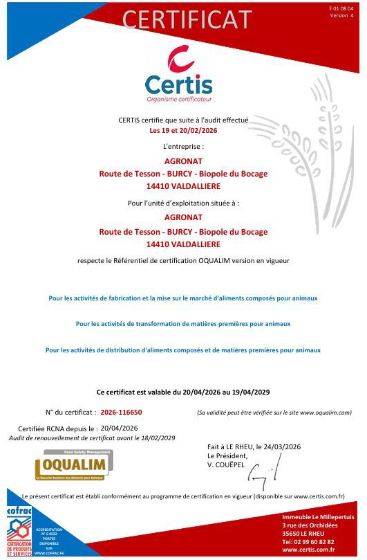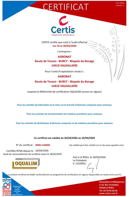 Vous trouverez ici notre certicat RCNA de respect du rèfèrentiel OQUALIM relatif à l'alimentation animale.